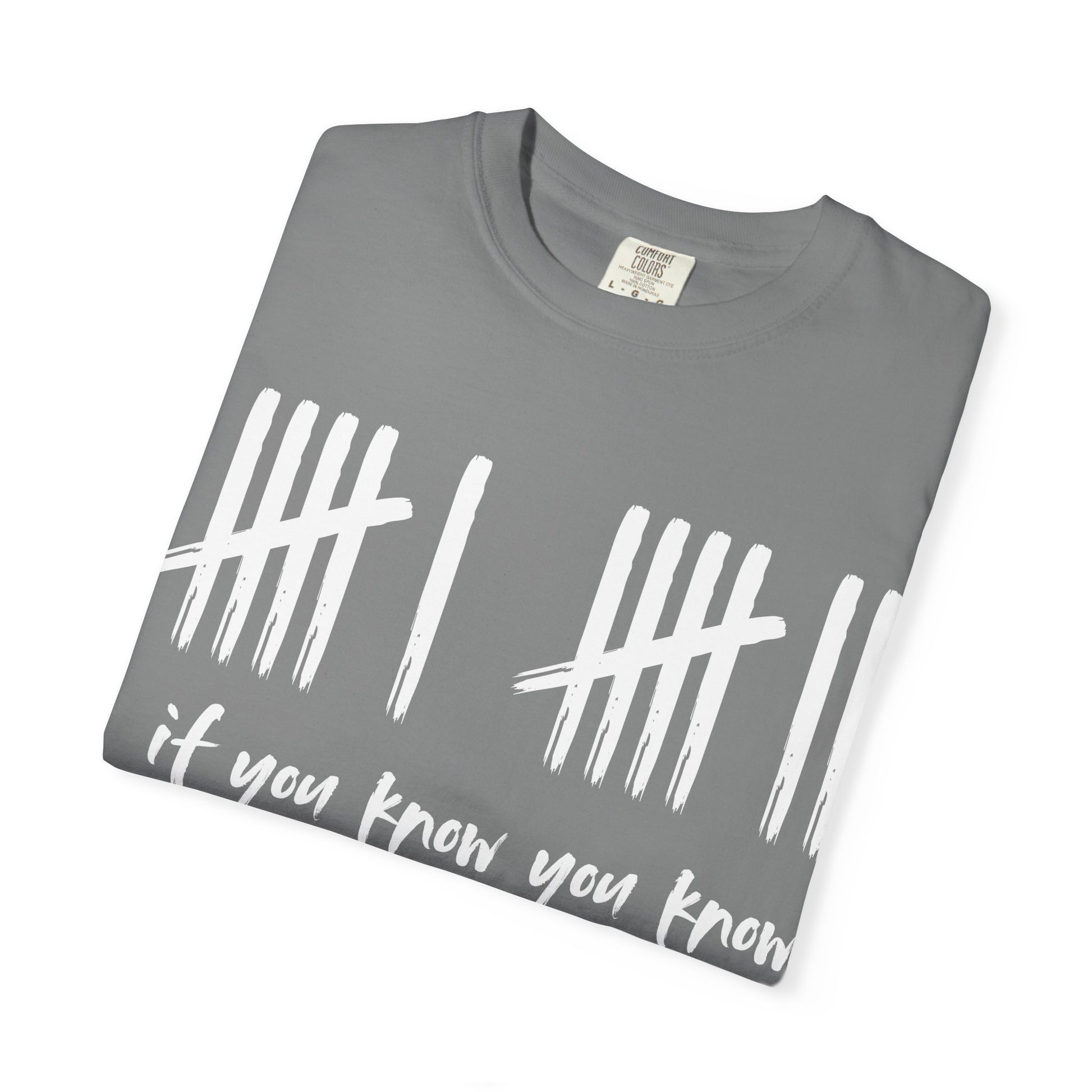 This relaxed garment-dyed tee reads like a quiet nod between friends — tally marks across the chest with the handwritten phrase “if you know you know.” It sits soft yet substantial on the body, with a lived-in color and texture that deepens with every wash. Wear it layered under a jacket for city nights or alone on slow mornings; it holds up to everyday life thanks to durable double-needle stitching and a tubular knit that keeps lines clean. The understated black ink on a clean field makes the message private and familiar — a shirt that feels like an inside joke you share with those who get it.
