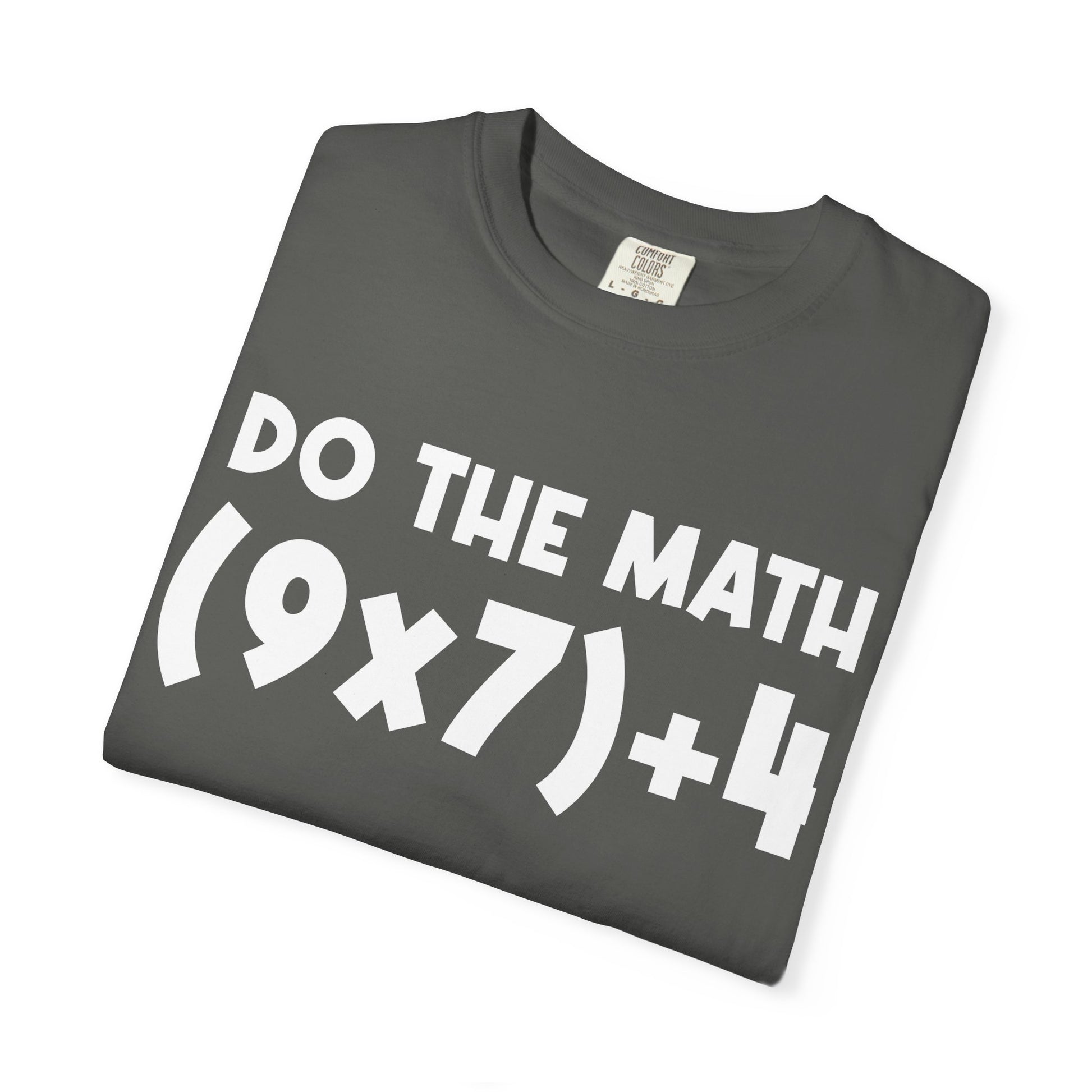 Lightweight, soft, and lived-in — this garment-dyed tee wears like a favorite from day one. The bold, hand-lettered front print reads “DO THE MATH (9x7)+4,” a playful nod to quick-witted students, teachers, and anyone who loves sly classroom humor. Cut with a relaxed fit and tubular construction, the shirt drapes casually and resists side seams for a clean silhouette. The medium-weight 100% ring-spun cotton becomes even softer after washing, while double-needle stitching keeps the shape wash after wash. Choose from a wide palette of colors and sizes to match your everyday rhythm — whether you’re grading papers, running errands, or trading math jokes over coffee.