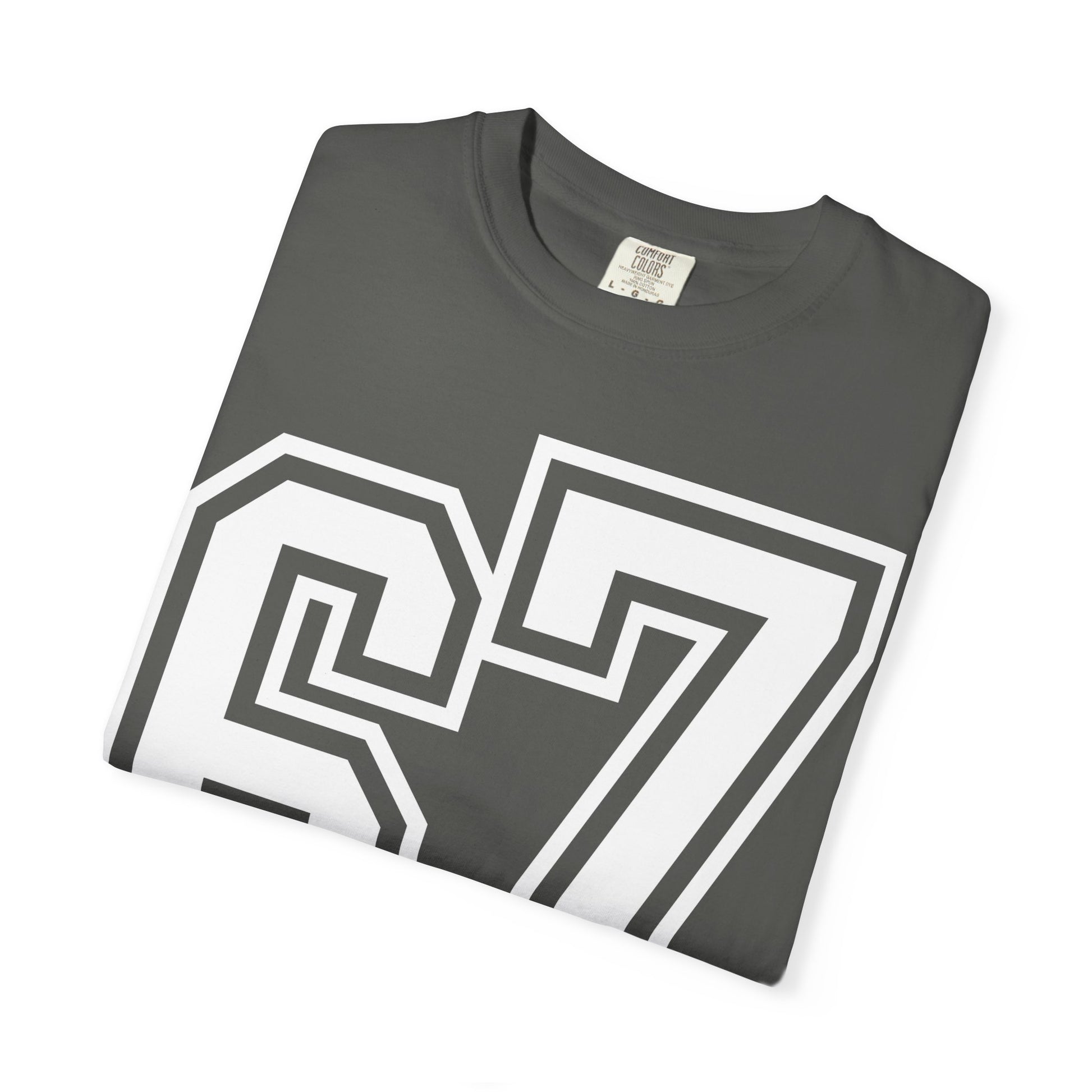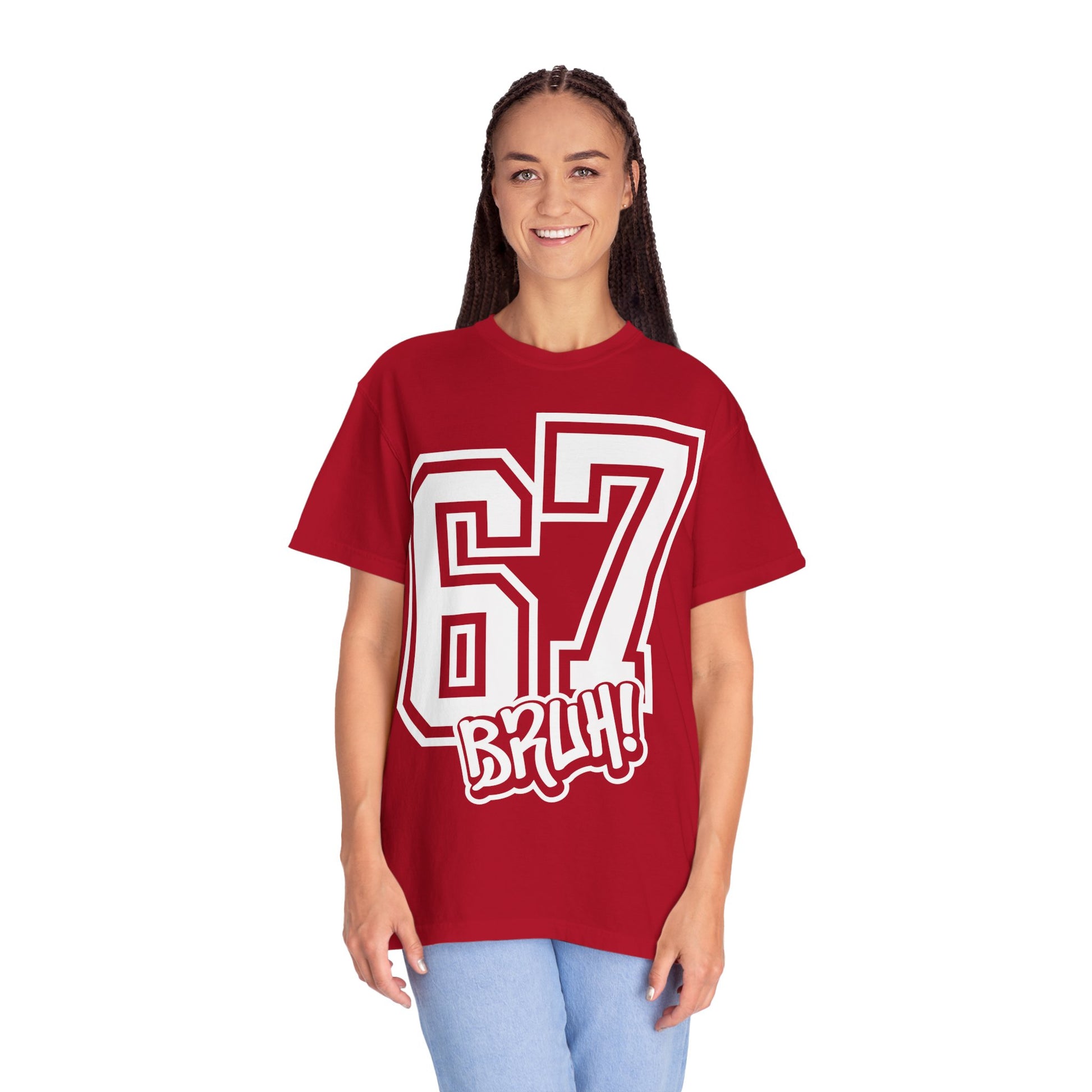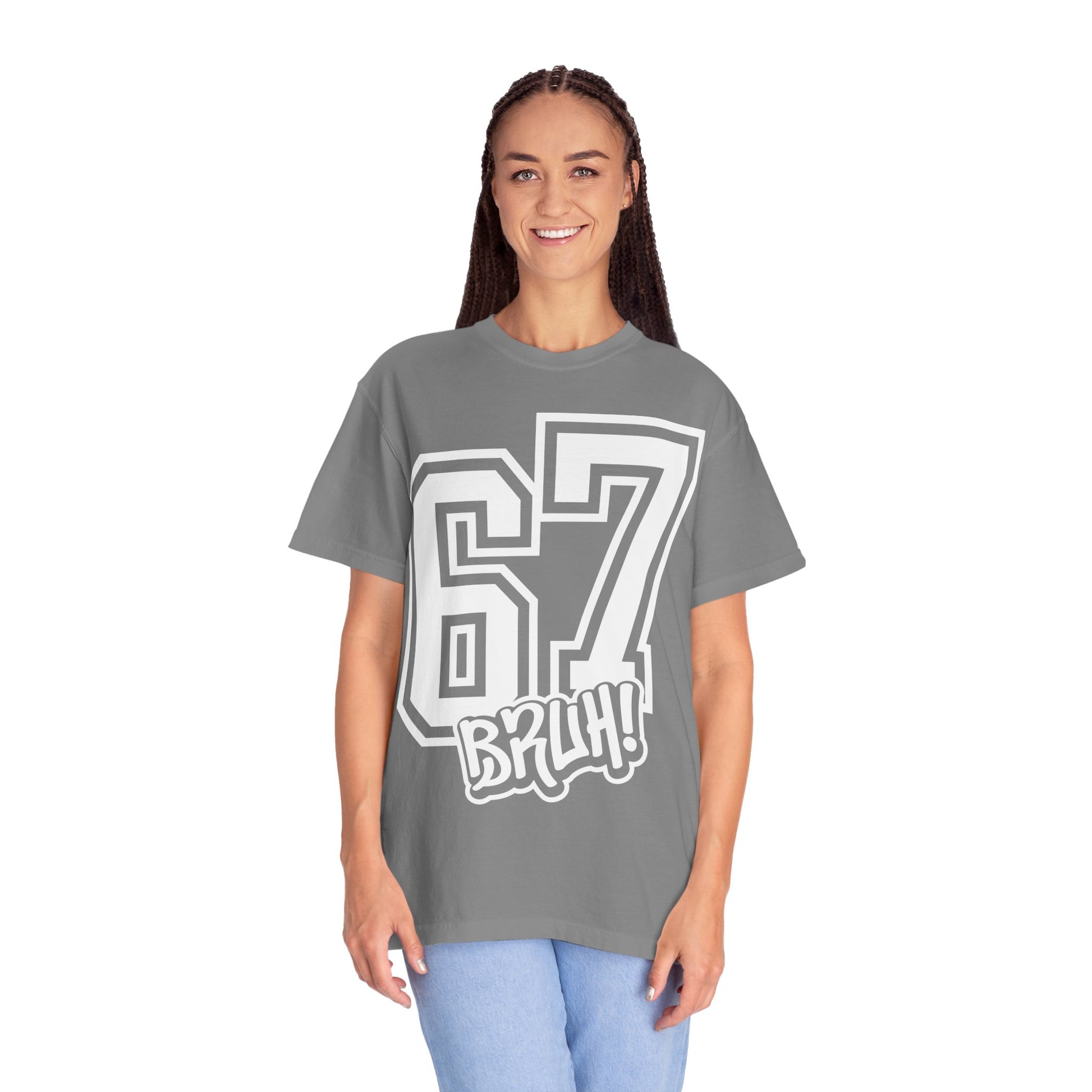 This relaxed, garment-dyed tee brings playful varsity energy to everyday wear. The bold “67” in athletic block numbers and the hand-lettered “BRUH!” below create a casual, tongue-in-cheek look that reads like a worn-in favorite from day one. The medium-weight, 100% ring-spun cotton feels soft against the skin thanks to post-construction dyeing, and the tubular knit with no side seams gives a clean, laid-back silhouette. Wear it to chill with friends, run errands, or layer under a flannel for a weekend hangout—this tee settles into your rotation and keeps its shape through wash after wash.