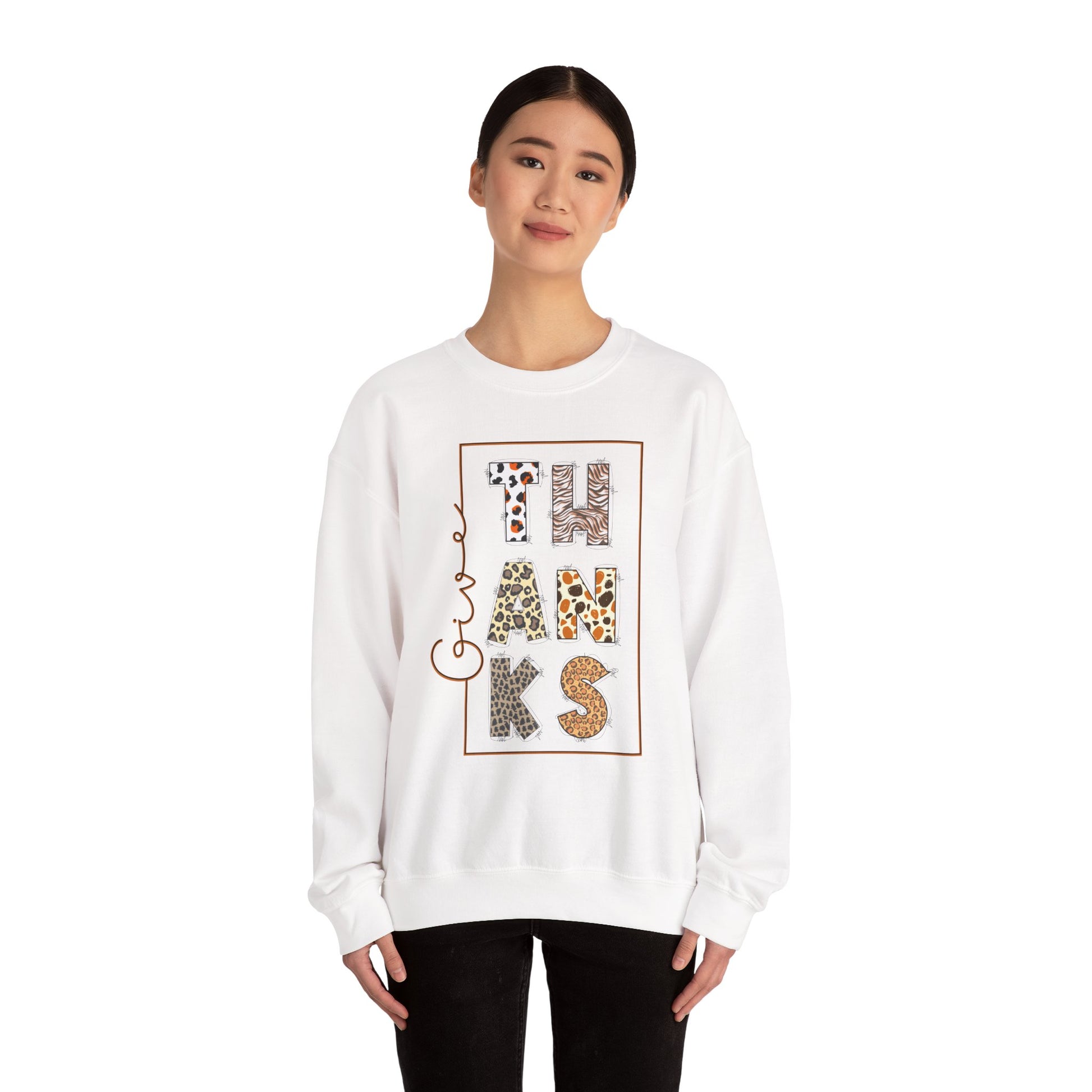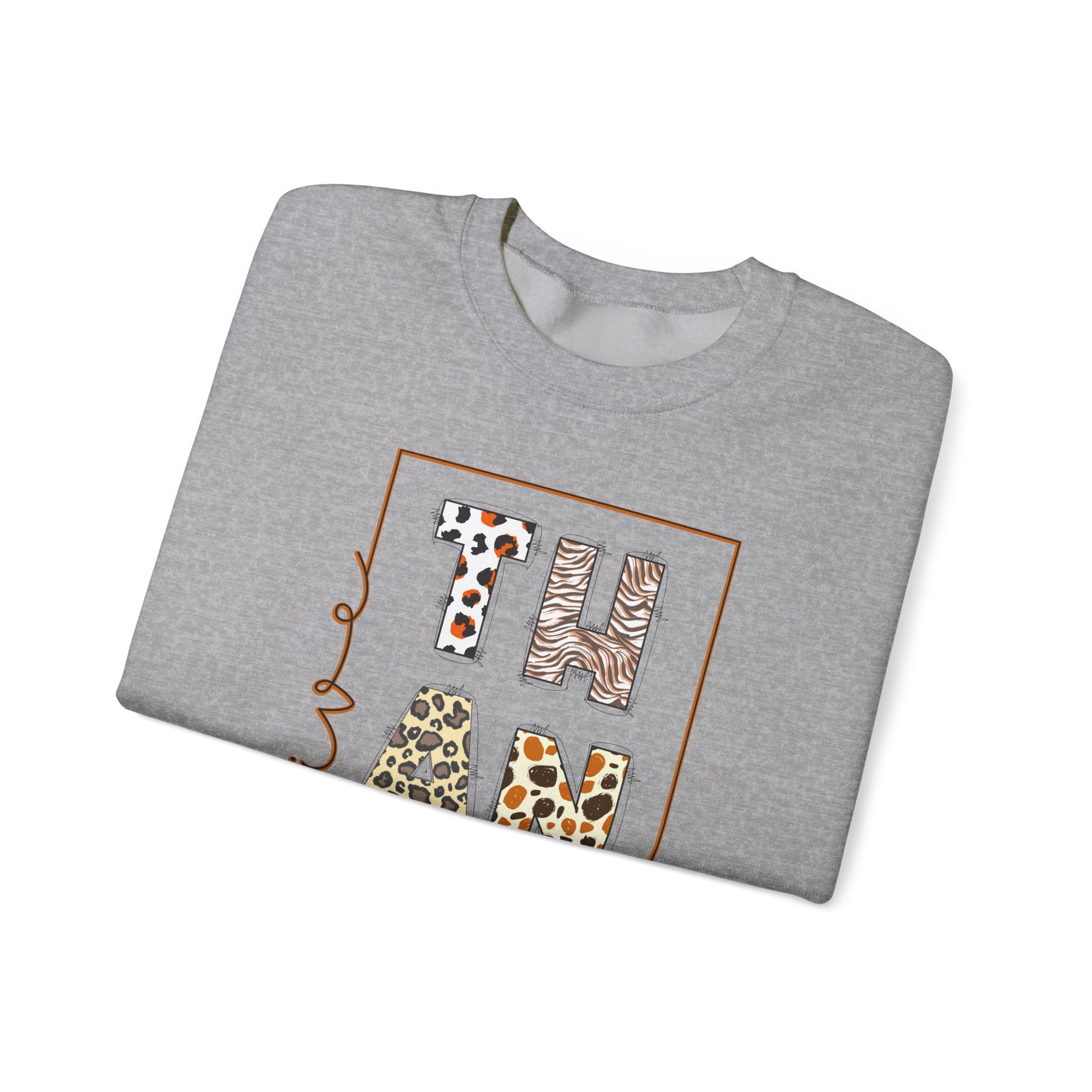 This cozy crewneck blends warm comfort with a playful, autumnal vibe. Soft yet sturdy, the sweatshirt carries a centered block-style design that spells out “THANKS” in mixed animal-print textures, with a flowing scripted “grateful” tucked along the side — small details that feel hand-crafted and sincere. Wear it on cool mornings with jeans and boots, or drape it over leggings for an easy, layered look. It’s the kind of sweatshirt you reach for when you want to feel grounded and a little whimsical during family dinners, casual get-togethers, or slow weekends at home.