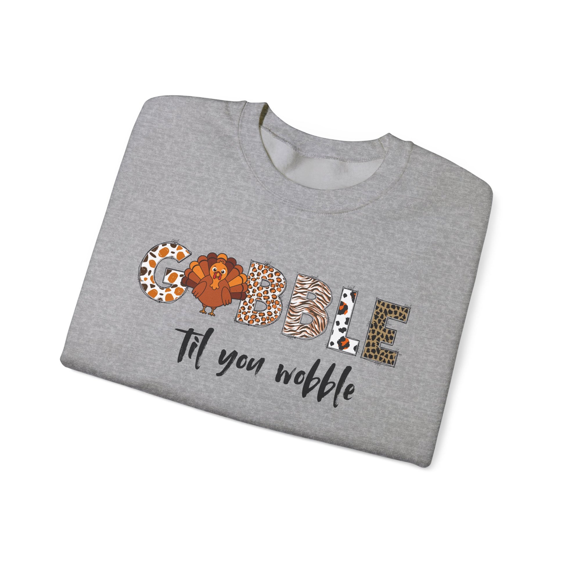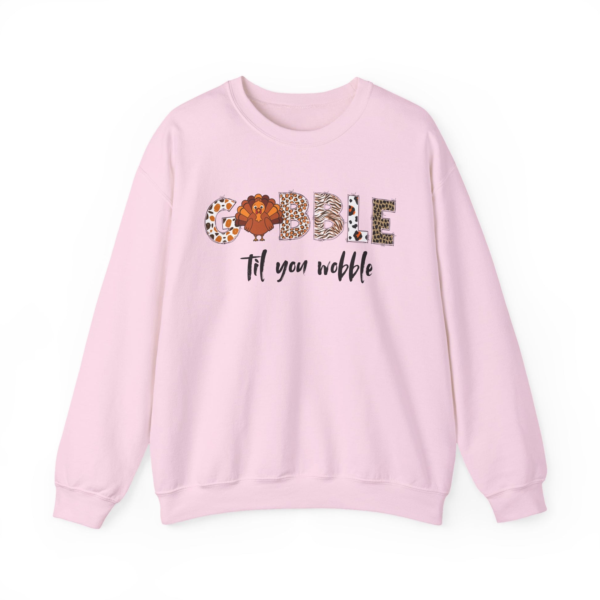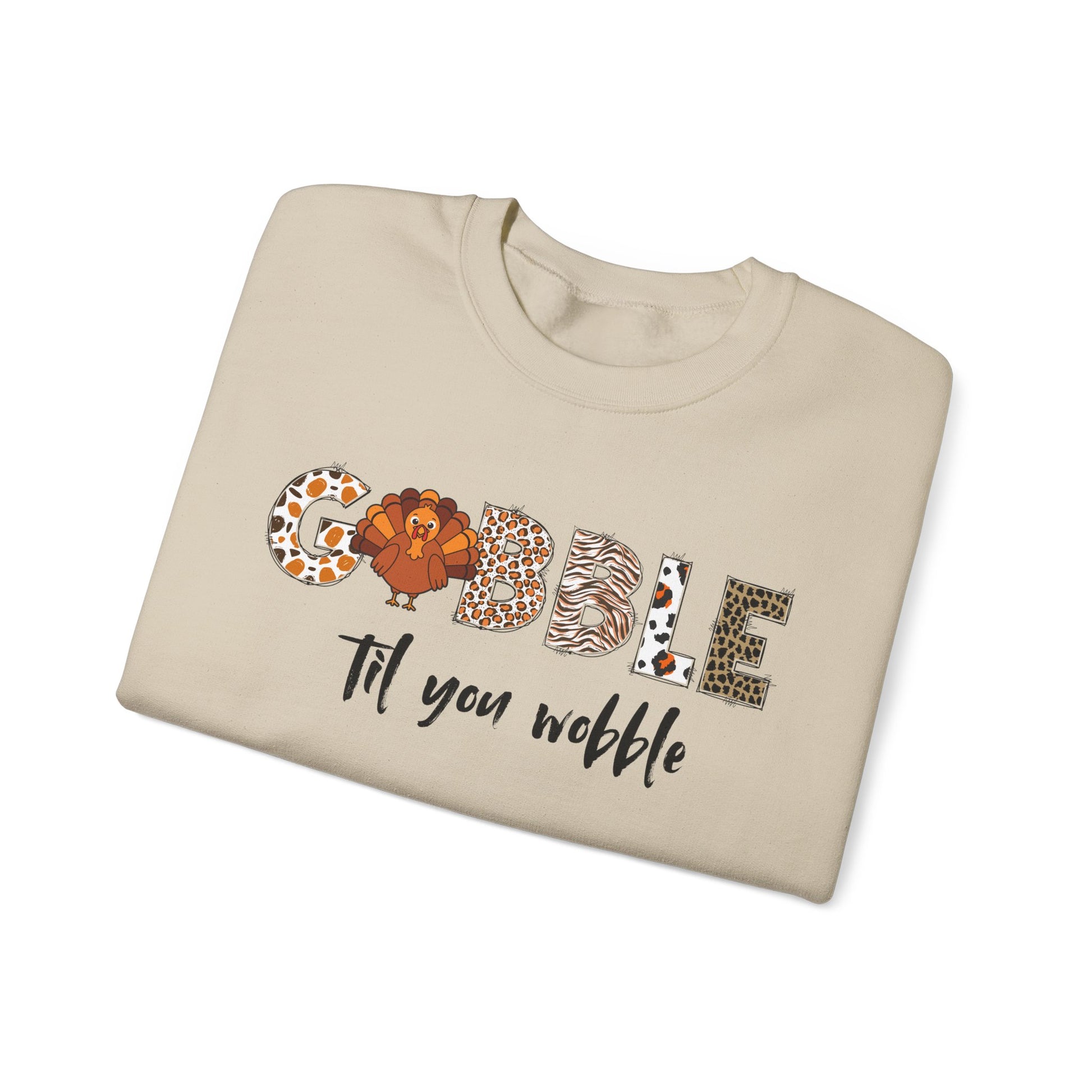 A cozy, cream crewneck that brings Thanksgiving mischief to your everyday wardrobe. Soft and substantial, the sweatshirt features playful typography spelling “GOBBLE” filled with autumn florals and a pumpkin centerpiece, with whimsical script reading “til you wobble” beneath. It wears like a warm hug on crisp mornings — easy to layer over tees or under a jacket while you wrangle pies, set the table, or linger over slow coffee. The crewneck’s clean lines and subtle design make it feel homey without shouting, so it blends seamlessly into family gatherings, casual outings, and low-key holiday prep.