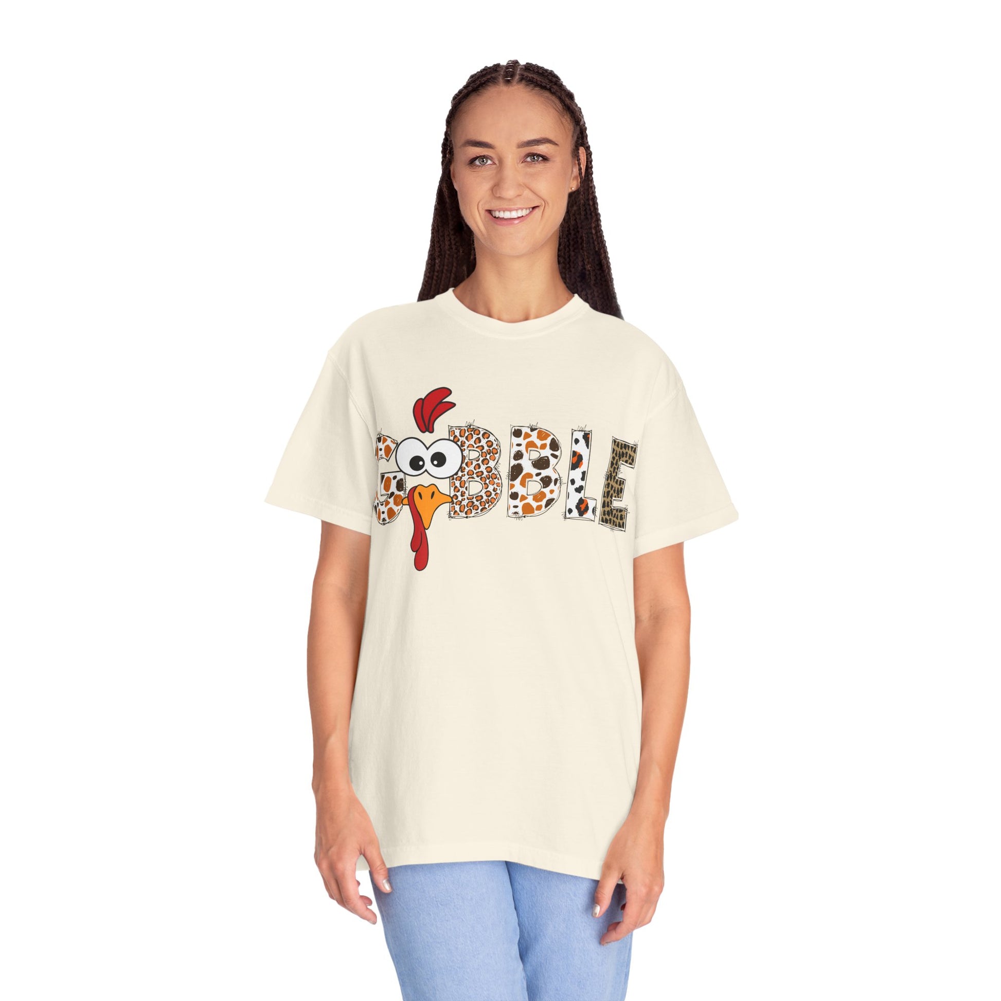 This relaxed, garment-dyed tee carries a playful Thanksgiving vibe — “GOBBLE” spelled out with a quirky turkey face and mixed animal-print letters. Soft, midweight cotton drapes comfortably for easy layering or lounging after a big meal. It’s the kind of shirt you reach for when the kitchen smells like roasting herbs and the living room fills with family laughter. Wear it to sit at the kids’ table, carve the turkey, or stroll off the feast with a warm drink in hand. The casual fit and lived-in color make it feel like an old favorite from the first wear, while the bold, whimsical graphic brings a lighthearted touch to holiday photos and gatherings.