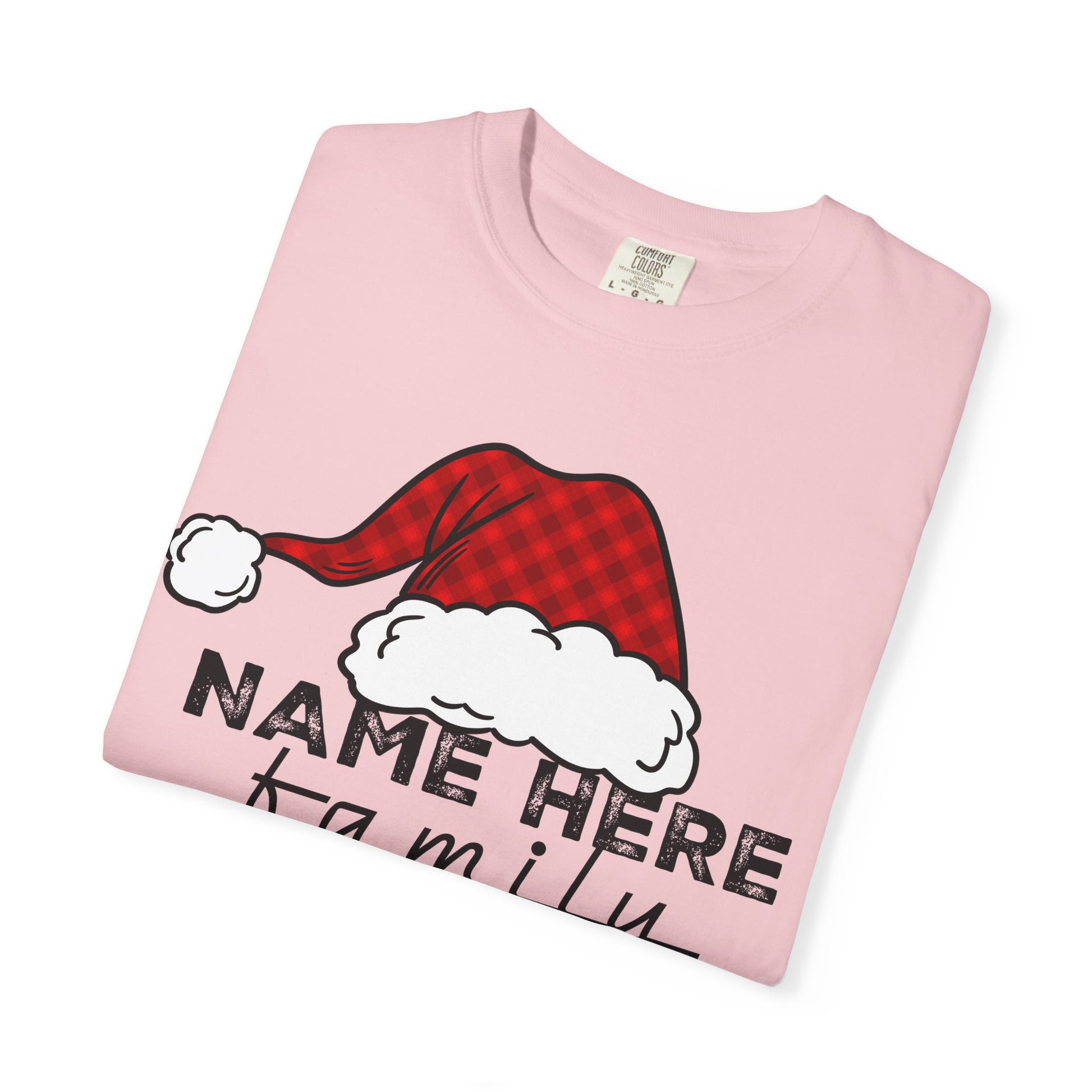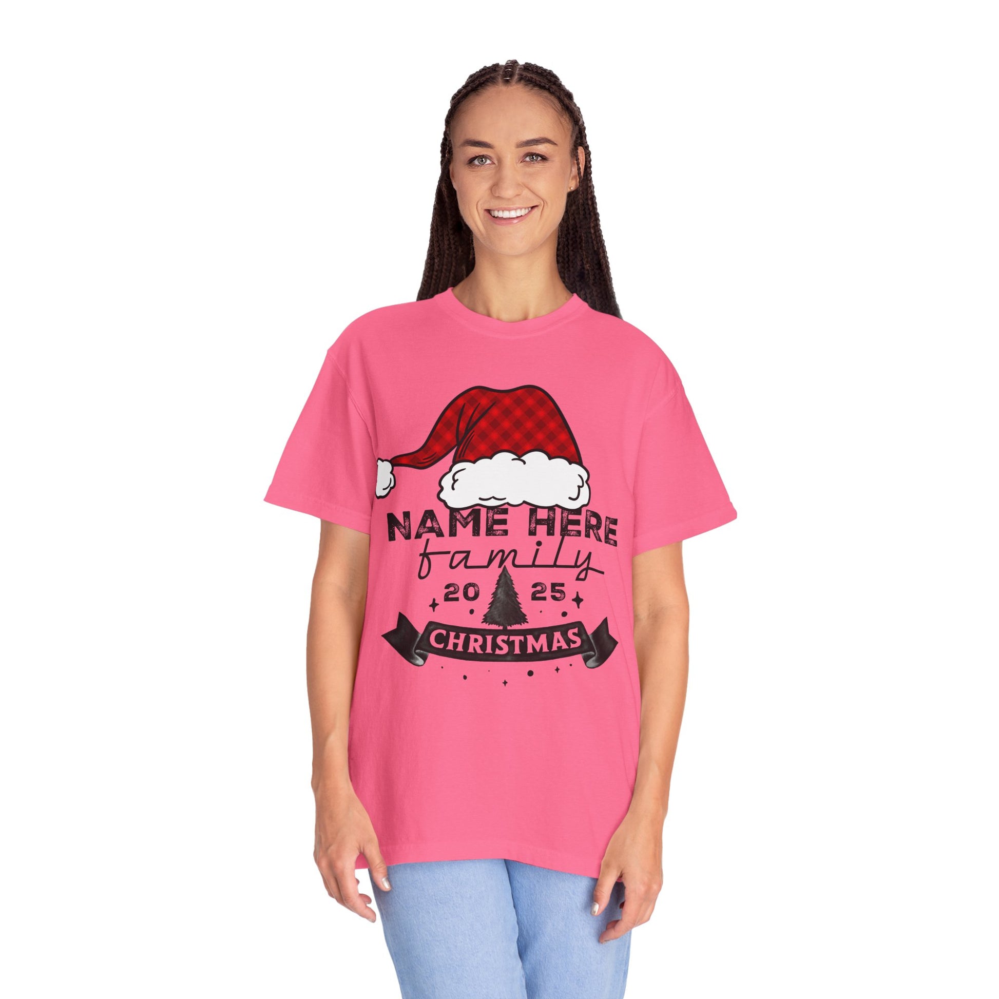 A soft, garment-dyed cotton tee with a cozy, homespun Christmas design that feels like slipping into a family memory. The relaxed-fit shirt drapes comfortably — worn alone at a holiday brunch or layered under a sweater for chilly evenings. The front print shows a rustic Santa hat, hand-lettered family name area, year, and a small pine motif, giving each shirt a personalized, lived-in look. The medium-weight fabric and tubular knit create a durable, textured canvas that will soften with every wash while keeping its shape. For anyone who gathers, laughs, and hangs lights together, this tee quietly carries the warmth of that season.