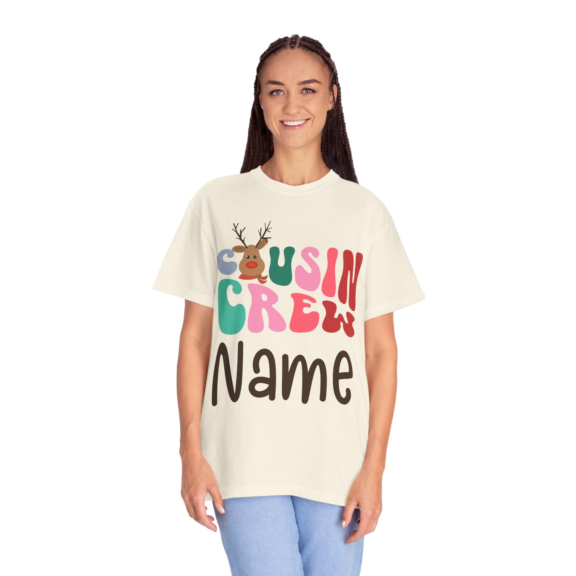 A relaxed, garment-dyed tee that brings playful holiday energy to family gatherings. Soft, lived-in cotton and the gently faded colors of post-dye fabric make this shirt feel like an old favorite from the first wear. The cheerful ‘Cousin Crew’ graphic with a friendly reindeer and space for a custom name turns casual days into shared moments — matching cousins, showing up at cookie exchanges, and laughing through family photos. Lightweight but substantial, it drapes comfortably for kids and adults who want a cozy, cheerful layer during winter visits, holiday brunches, or low-key family parties.