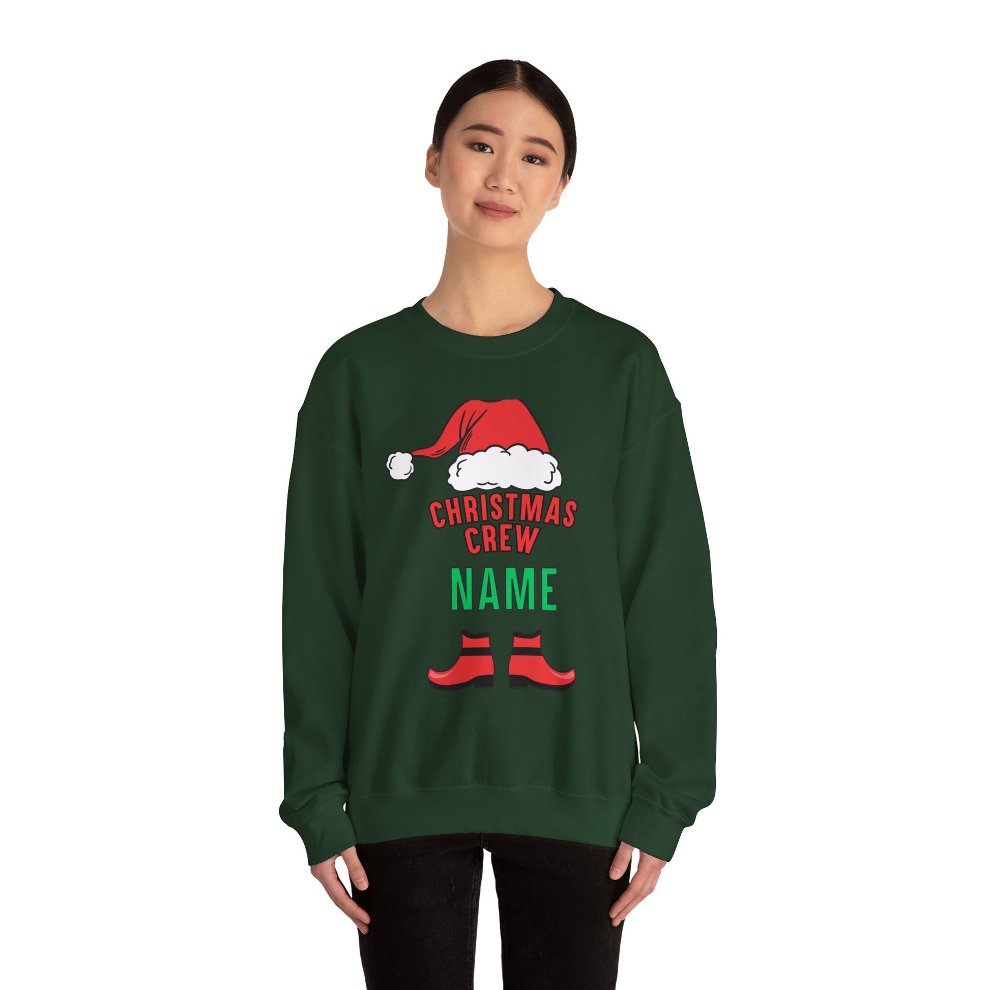 Soft, warm, and playfully festive — this crewneck wraps you in cozy holiday spirit. A cheerful Santa hat and elf boots frame bold lettering ready to be personalized with a family or group name, turning a simple sweatshirt into a shared memory. The smooth white fabric and clean crew neckline keep the look classic, while durable stitching and soft tear-away labeling make it comfortable for day-long wear. Wear it while stringing lights, sipping hot cocoa, or laughing through chaotic gift exchanges — it brings a little extra joy and togetherness to every holiday moment.