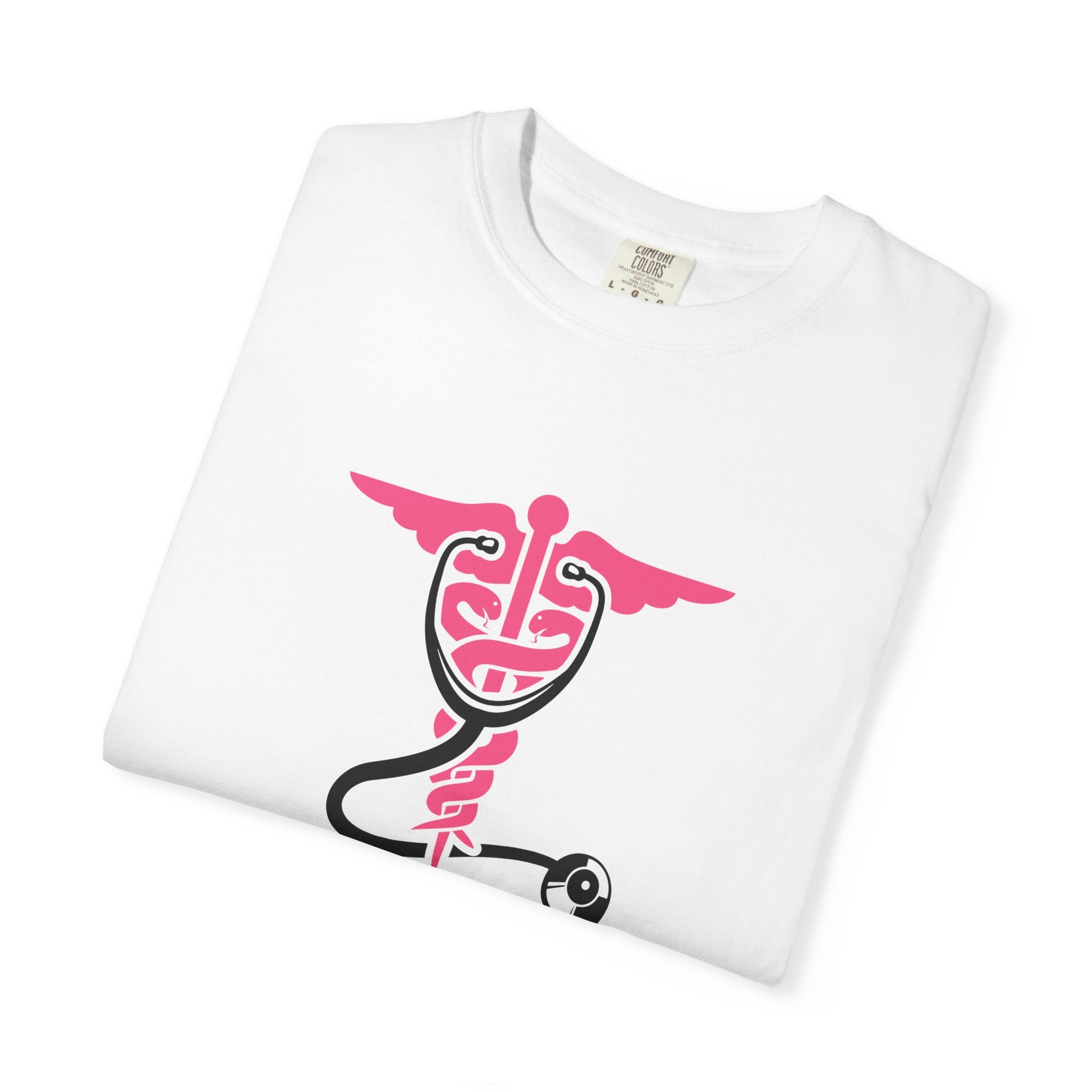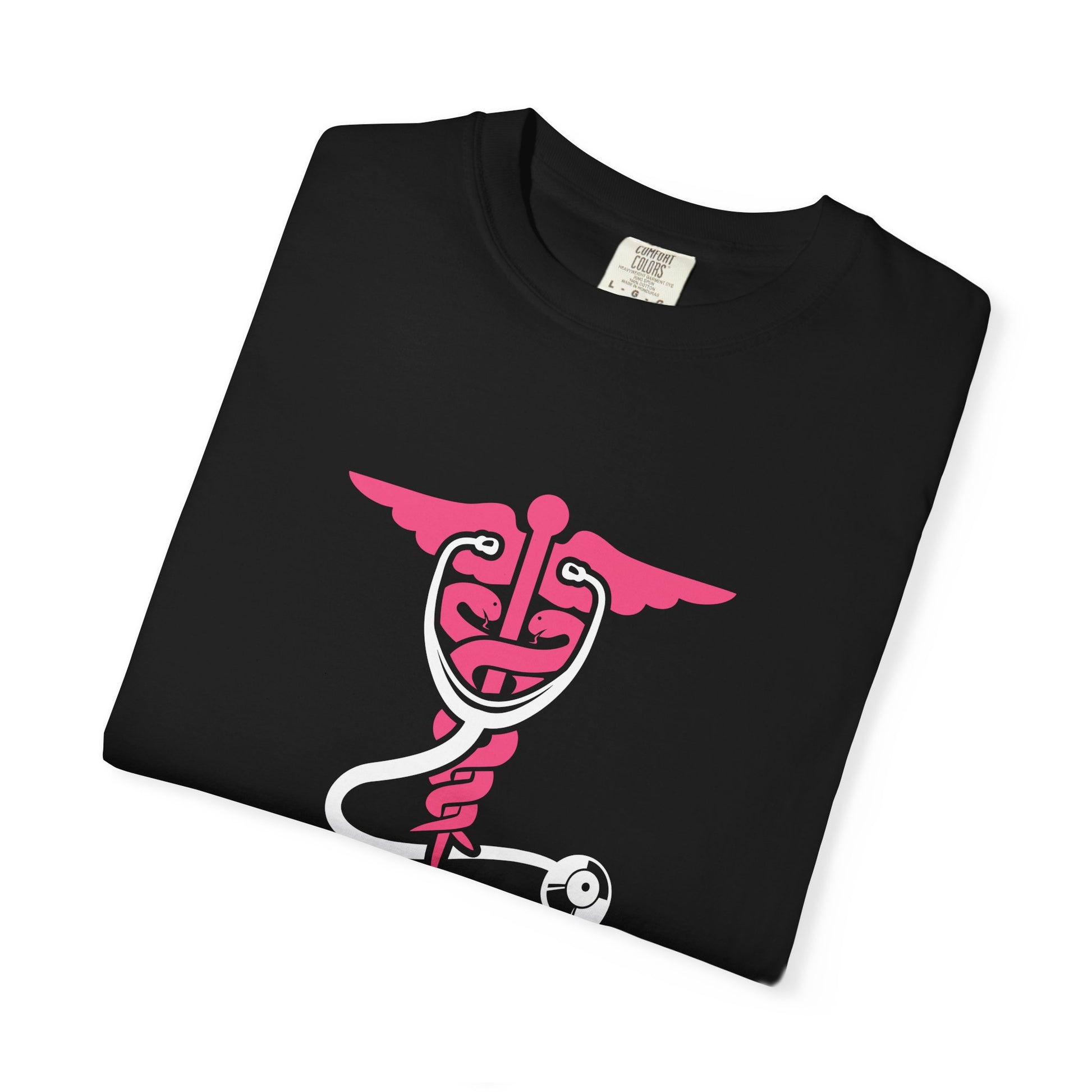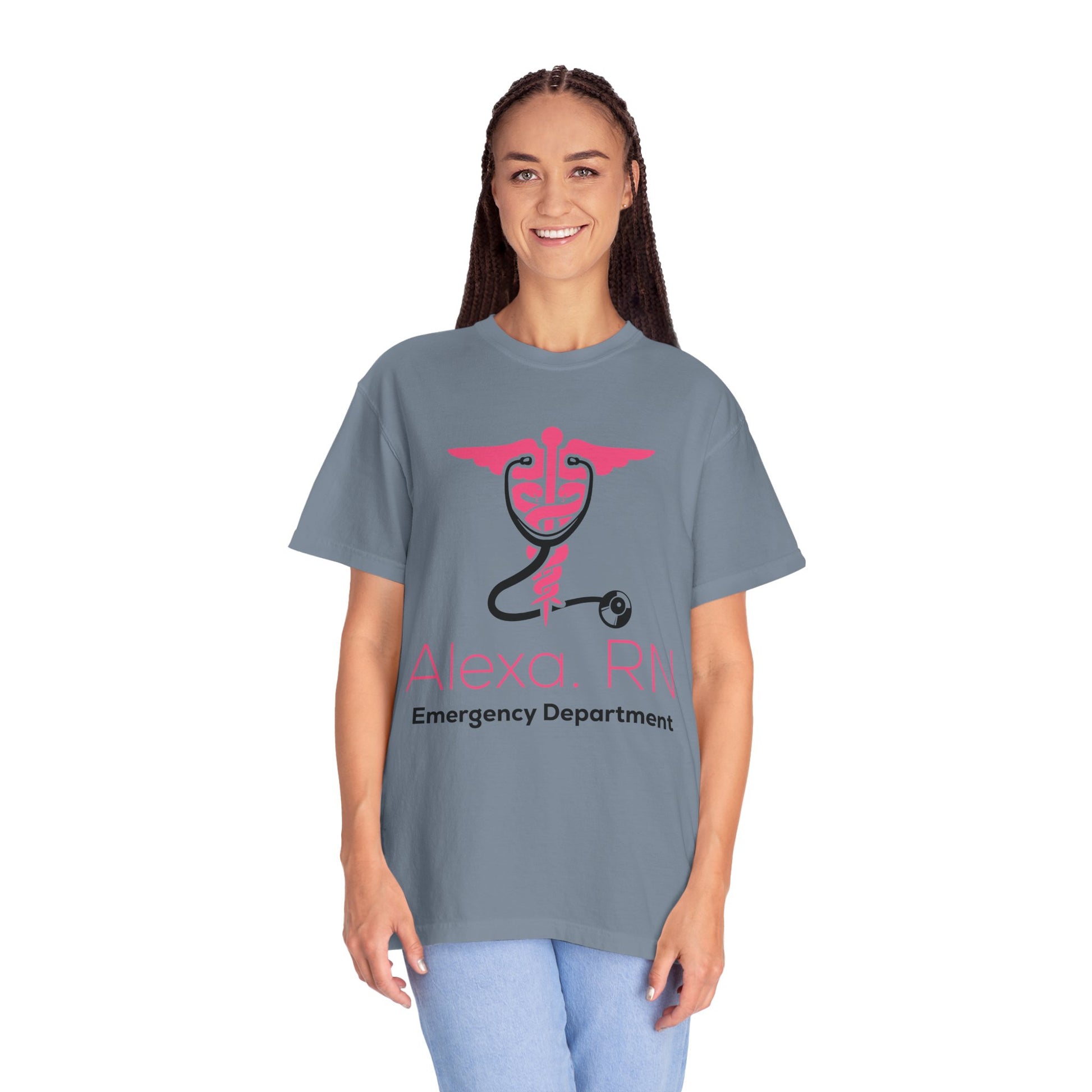 Soft, lived-in tee designed for nurses who carry calm and confidence into every shift. The garment-dyed cotton wears in, not out — the fabric softens with each wash and the colors mellow into a quiet, familiar hue. A delicate medical emblem and personalized name in gentle pink sit over the heart, balanced by a small Emergency Department line beneath. It reads like a quiet signature: professional, compassionate, and quietly proud. Comfortable on long shifts, easy to layer under scrubs or a jacket, and relaxed enough to feel like a reliable companion between patients and coffee breaks.