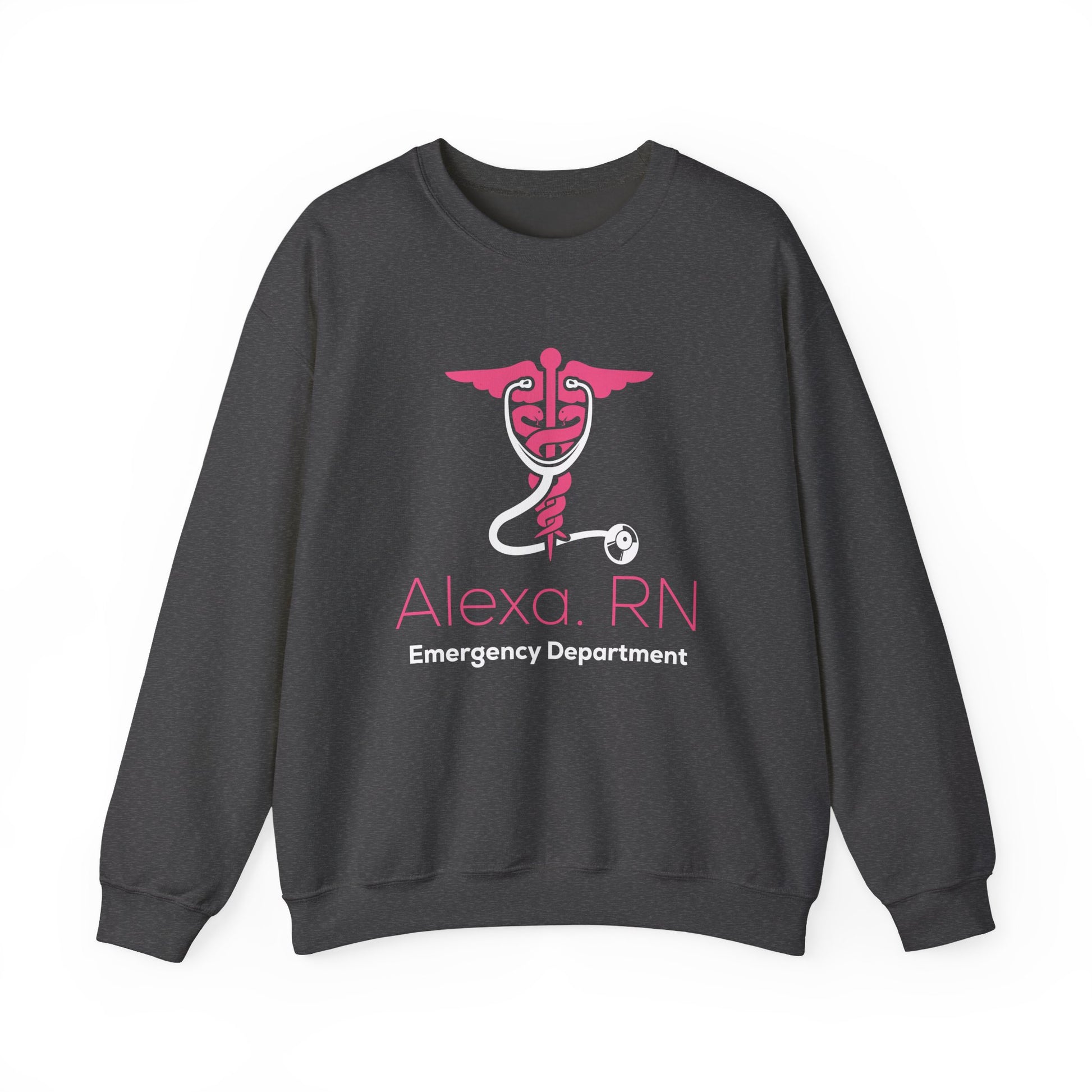 Soft, sturdy, and quietly confident — this crewneck celebrates the nurse who holds the line when every moment matters. The mid-weight cotton-poly blend feels familiar and warm after a long shift, while the clean crew neckline and classic fit keep the silhouette relaxed and professional. A tasteful medical emblem and personalized name line (shown here as “Alexa, RN”) sit over the heart, signaling pride in the Emergency Department without shouting. Wear it between shifts, on low-key days off, or layered under a jacket during chilly commutes — it settles into the everyday rhythms of a dedicated nurse.