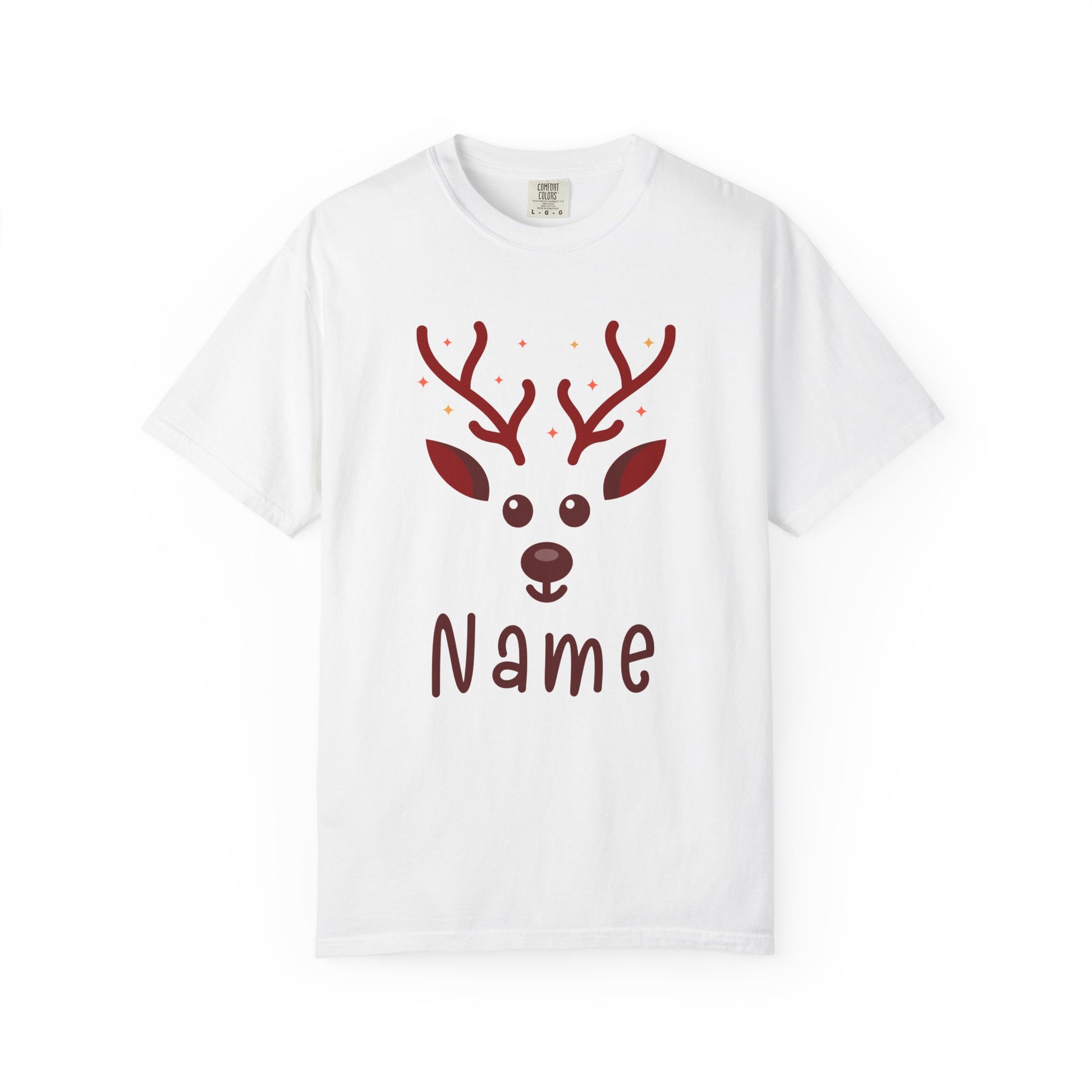 This relaxed-fit garment-dyed tee carries a whimsical reindeer face and a customizable name below, bringing a cozy, handmade feel to winter mornings and holiday gatherings. The soft, broken-in color and medium-weight cotton drape comfortably for layering or wearing on its own. Picture family pajama photos, tree-trimming afternoons, and hot cocoa by the window — this shirt settles into those moments and feels like part of the memory. Subtle details like the tubular knit (no side seams) and sewn-in label keep the silhouette clean while double-needle stitching and 100% ring-spun cotton make it durable through repeated wears. Choose from many colors and sizes to match the look you want, whether you want a muted, vintage vibe or a brighter cheerful tone for kids and grown-ups alike.