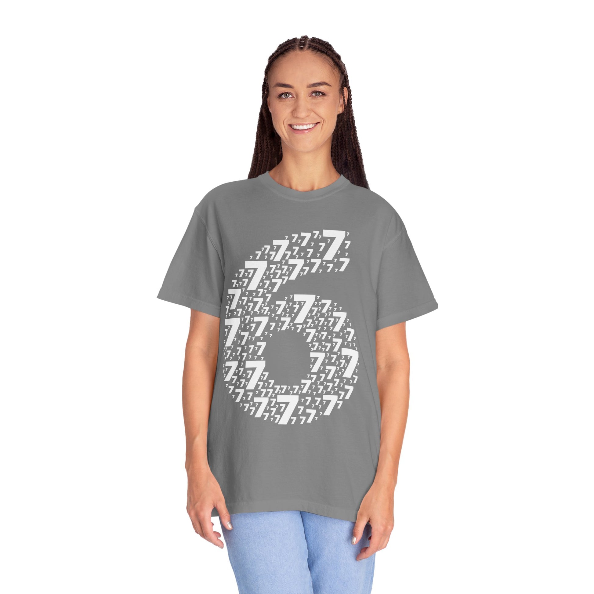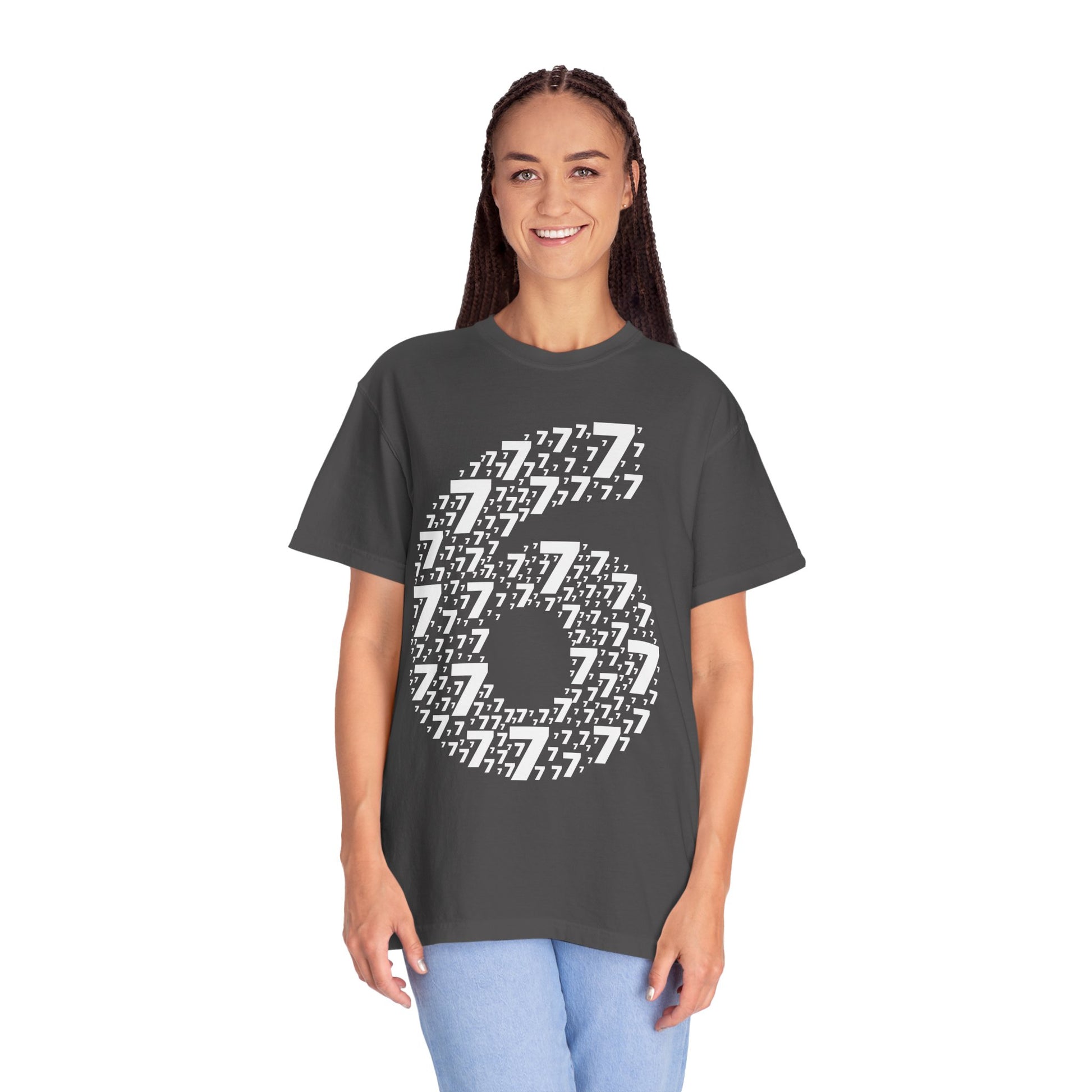 A soft, garment-dyed tee that feels lived-in from the first wear. The relaxed cut and medium-weight 100% ring-spun cotton drape easily, while the subtle texture from post-construction dyeing gives each shirt unique depth. The front graphic — a bold, typographic mosaic forming the number 6 — reads like street-style signage and pairs cleanly with denim or layered under a jacket. Durable double-needle stitching and a tubular, side-seam-free build keep the silhouette simple and long-lasting. Wear it to low-key meetups, casual shows, or when you want a quiet statement that ages with you.